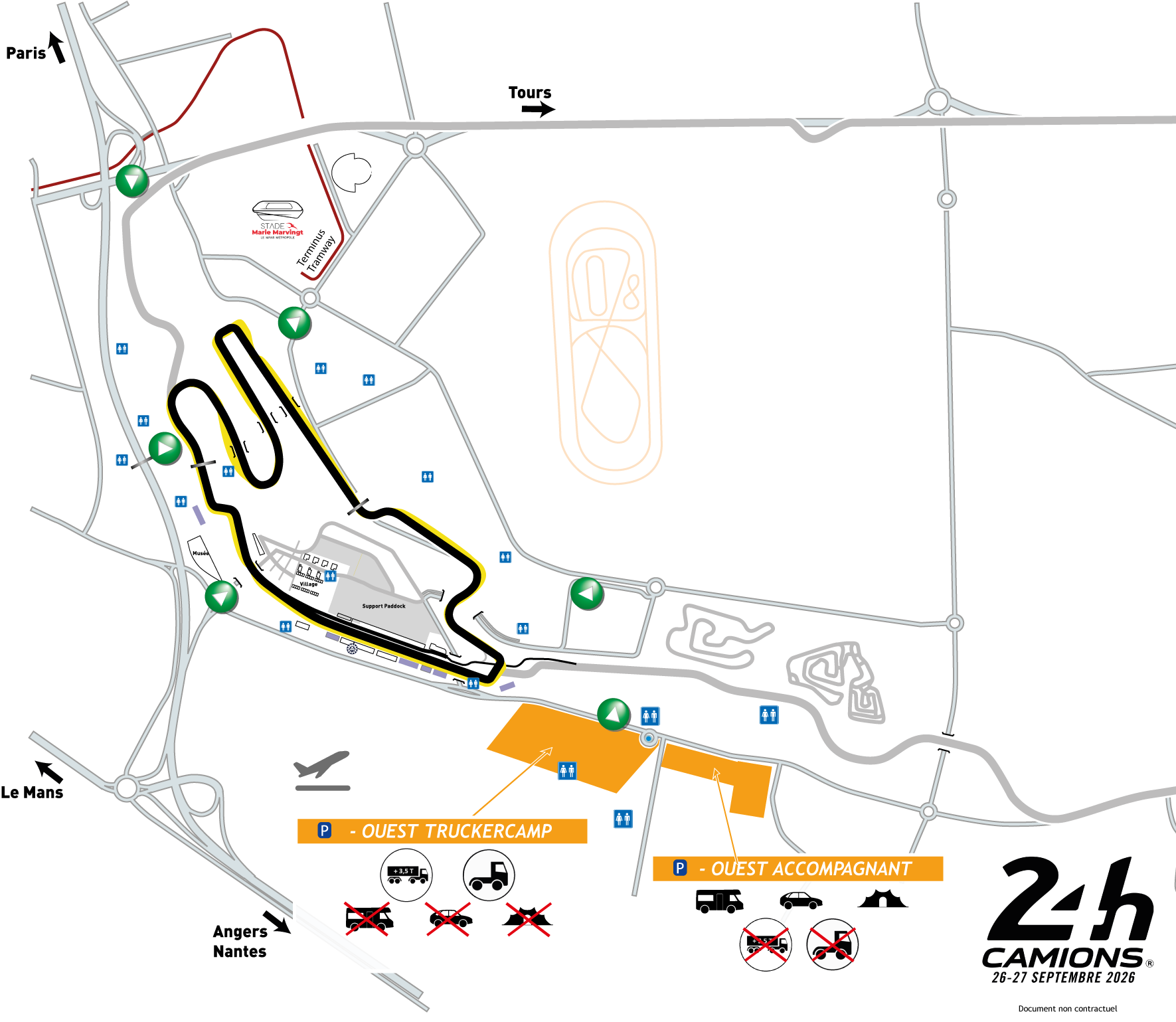 - Vous avez la possibilité de réserver un emplacement supplémentaire pour un accompagnant en véhicule léger (camping-car / tente) en cochant l'option lors de votre achat (parking situé en face du Trucker Camp). Ce véhicule sera stationné dans une zone de campement à proximité de la zone de stationnement des poids lourds.